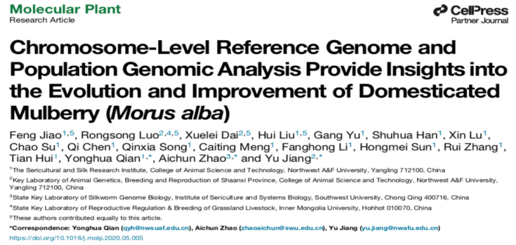 研究結(jié)果1:利用得到的14 Mb SNP對(duì)廣東桑以外的其余四種桑樹進(jìn)行了聚類分析,未得到與形態(tài)分類相似的聚類結(jié)果,基因組數(shù)據(jù)支持《中國(guó)植物志》中將白桑、魯桑、山桑和瑞穗桑這4種栽培桑樹種合并的結(jié)論。首次用基因組數(shù)據(jù)明確了栽培桑樹物種分類,認(rèn)為白桑、魯桑、山桑和瑞穗桑都屬于一個(gè)物種,即白桑(Morus alba?L)。