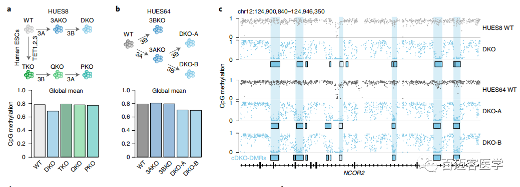 通常,如果不被DNMT3A或DNMT3B抵消,這種活性將導(dǎo)致胞嘧啶修飾的連續(xù)轉(zhuǎn)換和整體甲基化的降低。在這種范式下,人們可能會期望ESC在TET丟失后顯示出整體甲基化增加,因為這將使平衡向DNMT3活性轉(zhuǎn)移。與期望相反,并且如先前在癌細(xì)胞中所指出的,與匹配的WT相比,在缺乏TET的細(xì)胞中也觀察到了輕微的下降。與WT相比,這可能與TKO細(xì)胞的生長速率增加有關(guān),這也可能影響甲基化維持。