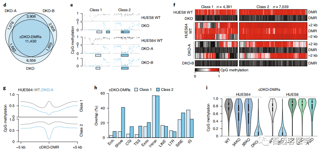 為了進一步研究這種甲基化缺失,接下來從另一個人類ESC系(HUES64)(包括2個獨立的DKO克?。ˋ和B))WT和DKO細(xì)胞進行了甲基化測序,并將甲基化水平與先前衍生的18個單DNMT3A-/-(3AKO)和單DNMT3B-/-(3BKO)敲除數(shù)據(jù)作比較(圖1b)。兩種不同的雄性WT ESC似乎具有可比性,具有相似的整體甲基化平均值(HUES64,0.79;HUES8,0.78),并且在1kb分辨率上具有較高的相關(guān)性(Pearson系數(shù)=0.93)。有趣的是,盡管第22代的單DNMT3基因敲除仍保持高度甲基化(3AKO,0.81;3BKO,0.79),但2個HUES64 DKO克隆僅經(jīng)過3代后甲基化降低至0.70(圖1b)。當(dāng)我們以堿基對的分辨率檢查數(shù)據(jù)時,觀察到2個不同的動態(tài)類別:0.1-0.2的細(xì)微下降,影響了整個基因組范圍內(nèi)約10%的CpG,以及,在CpG島內(nèi)局部發(fā)生的甲基化幾乎完全喪失的CpG位點(圖1c)。使用嚴(yán)格的標(biāo)準(zhǔn)(甲基化差異> 0.6,P <0.01,F(xiàn)檢驗)來定義差異甲基化區(qū)域(DMR)。DKO-DMR在3個DKO譜系上都非常一致(圖1c,d)。因此,定義了在所有3個樣品中均被甲基化的“一致性”的11,430個cDKO-DMR,cDKO-DMR始終保持較低水平(平均WT,0.749;DKO,0.086),平均長度為688個堿基對(bp)。WT ESC中大約三分之一cDKO-DMR鄰近低甲基化區(qū)域,例如CpG島和轉(zhuǎn)錄起始位點(稱為“1類”),而其余的cDKO-DMR則位于其他高度甲基化的區(qū)域(內(nèi)含子或基因間),具有明顯的高甲基化邊界(稱為“第2類”;圖1e–h)。幾乎所有的cDKO-DMR(93%)都被DNMT3A或-3B甲基化,僅在DKO中被完全去甲基。