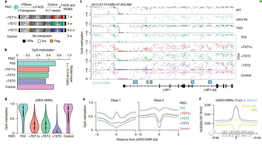 為了驗證cDKO-DMR是否依賴并持續(xù)誘導(dǎo)TET活性,利用PiggyBac轉(zhuǎn)座將外源TET1(短isoform簡稱TET1s)、TET2和TET3重新引入PKO細(xì)胞中,并使用WGBS測量了總體甲基化水平(圖2a)。在異位表達每種蛋白質(zhì)后,PKO細(xì)胞的總體平均甲基化水平從第20代的0.73明顯降低到了異位表達每種蛋白質(zhì)后的0.61、0.59和0.54,而僅用轉(zhuǎn)座酶轉(zhuǎn)染的對照細(xì)胞保持穩(wěn)定(平均值=0.70;圖2b)。重新引入任何TET酶可在很大程度上恢復(fù)TKO細(xì)胞中異常高甲基化的區(qū)域,誘導(dǎo)快速的cDKO-DMR去甲基化(圖2c-e)。從機理的角度來看,TET1s亞型缺乏CXXC結(jié)構(gòu)域,無法募集至未甲基化的CpG密集區(qū)域,但TET1和TET2 rescue結(jié)果之間無明顯差異,支持了CXXC結(jié)構(gòu)域無關(guān)的募集機制。TET及其作用相反的酶在cDKO-DMRs上的持續(xù)動態(tài)也得到了已發(fā)表的染色質(zhì)免疫沉淀的支持,隨后進行ChIP-seq,該數(shù)據(jù)表明WT ESC中DNMT3B和TET1均富集,盡管富集在比相當(dāng)狹窄且定義明確的cDKO-DMR邊界更寬區(qū)域。最后,進行了全基因組氧化亞硫酸氫鹽測序(oxBS),并在WT細(xì)胞中發(fā)現(xiàn)了5hmC的顯著局部富集(平均cDKO-DMRs,0.07;背景,0.01;圖2f)。