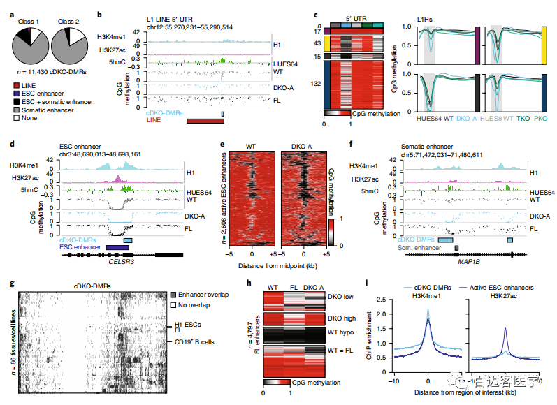 為了探索這種局部調(diào)節(jié)的動態(tài)甲基化的保守性,在小鼠表皮干細(xì)胞(EpiSCs)中突變了Dnmt3a和Dnmt3b,因為它們代表了與人類多能細(xì)胞最接近的發(fā)育和分子類似物。在第4步對WT和DKO細(xì)胞進行了WGBS測序,并鑒定了3888個與人類DKO-DMR具有相似特性的DMR,與82%的推定體細(xì)胞增強子重疊。雖然數(shù)量、√確序列和坐標(biāo)未直接在物種之間map,但小鼠DKO-DMR出現(xiàn)在非常相似的位置且與直系同源基因接近(圖4a)。因此,在體細(xì)胞增強子處甲基化轉(zhuǎn)換的機制和這些區(qū)域的調(diào)控模式都看起來非常保守。