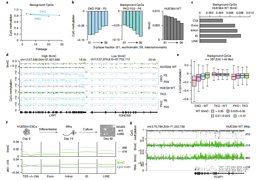 將WT HUES64 ESC分化為有絲分裂后的運動神經(jīng)元,其中5hmC不能通過分裂被動稀釋,以更具體地跟蹤TET的參與度和催化活性。培養(yǎng)60天后,基因(特別是表達的基因)和基因間基因座內(nèi)富集了5hmC水平,其中*大的增加發(fā)生在惰性染色質(zhì)內(nèi),支持了TET的廣泛氧化(圖5f,g)。因此,TET通過運動神經(jīng)元以及ESC的基因組保持了廣泛氧化甲基胞嘧啶的能力。