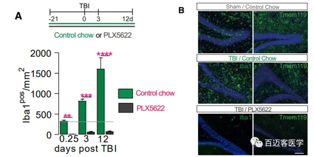 圖1B.plx5622處理小鼠術(shù)后12天海馬內(nèi)Iba1pos和TMEM119pos小膠質(zhì)細(xì)胞(綠色)的丟失