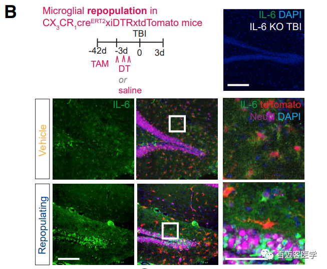 ?圖4 .TBI遺傳模型小鼠中IL-6的細(xì)胞來源及正在進(jìn)行再生的小膠質(zhì)細(xì)胞