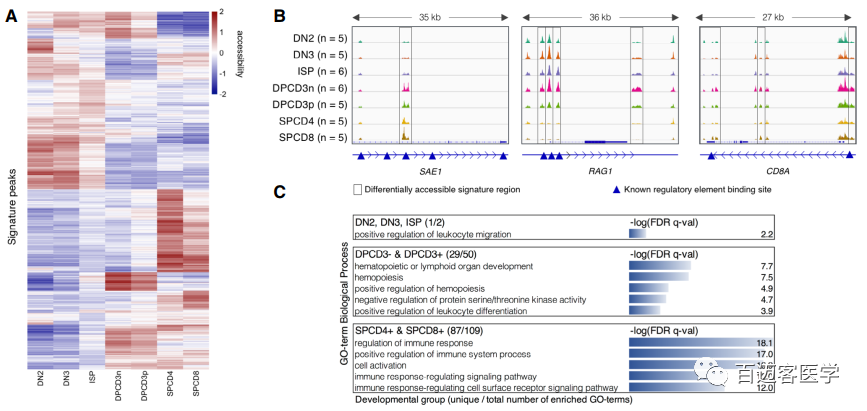 所有特征區(qū)域聚類熱圖將7個T細胞類群按其成熟的順序聚集在一起,突出了T細胞成熟過程中染色質可及性的持續(xù)變化(圖2A)。連續(xù)發(fā)育階段的逐漸變化導致了DN3和ISP之間的輕度分離,雙陽性階段CD3–和CD3+(圖2A)導致在使用CIBERSORT反褶積算法預測細胞類型預測精度不理想。利用主成分1和2的轉換,量化了特征OCRs的重要性并發(fā)現(xiàn)SUMO1激活酶亞基1上有一個峰(圖2B)。此外,OCRs差異可及性附近有階段性特征已知基因如CD8A和RAG1/2(圖2B)。雙陽性組OCRs在與造血和白細胞分化相關的terms富集,單陽性組在免疫系統(tǒng)調節(jié)相關的terms富集(圖2C)。然而,雙陰性特征峰只富集在一個GO-term即白細胞遷移正調節(jié)(圖2C)。