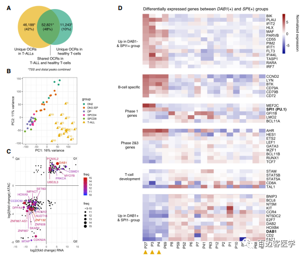 由于患者異質性較高(圖5B),作者對每個患者進行了DESeq2差異分析鑒定復發(fā)事件。與健康T細胞前體相比,作者在至少5個T-ALLs中鑒定出292個差異基因和差異可及性OCRs(圖5C)。102個峰/基因可及性強并過表達,191個峰/基因可及性弱并低表達(圖5C)。4例未表達DAB1的患者(P3、P4、P27和P69)形成了一個不同的亞群其特征是SPI1過表達,發(fā)育早期DN2貢獻率特別高(圖4C),3例患者TF SPI1(PU.1)結合位點可及性更高(圖4E)?;虮磉_和染色質可及性差異分析顯示,表達SPI1的患者以基因過表達/超可及性為特征,并決定了T細胞發(fā)育的早期第一階段。這些基因包括MEF2C、MEIS1和HOXA9 ,基因特征為B細胞前體如LYN、BTK、cyclin D2、CD79A、CD79B和CD72(圖5D)。DAB1過表達和超可及性T-ALLs趨向于T細胞發(fā)育后期2和3階段過表達基因如TCF7、LEF1和RUNX1(圖5D)。綜上所述,這些數(shù)據(jù)涉及到DAB1和SPI1一個未知的相互排斥的生物學意義,并將T細胞發(fā)育階段,即兒童T- ALLs可能起源于成熟T細胞發(fā)育途徑的不同層次,盡管早期水平始終一致。