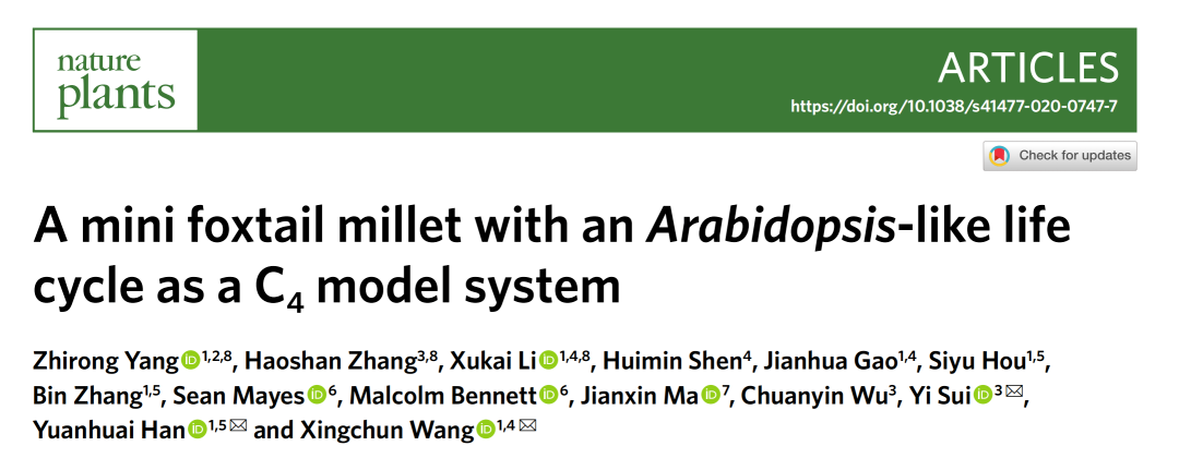 2020年8月31日,山西農(nóng)業(yè)大學雜糧分子育種團隊與中國農(nóng)業(yè)科學院作物科學研究所等單位合作研究論文“A mini-foxtail millet with an Arabidopsis-like life cycle as a C4 model system”在線發(fā)表于國際期刊Nature Plants(IF:13.256),報道了C4禾谷類研究的理想模式植物“小米”的研究成果。山西農(nóng)業(yè)大學的楊致榮教授、中國農(nóng)業(yè)科學院作物科學研究所的張皓珊博士和山西農(nóng)業(yè)大學的李旭凱副教授為論文的共同第一作者;山西農(nóng)業(yè)大學的王興春教授、韓淵懷教授和中國農(nóng)業(yè)科學院作物科學研究所的隋毅副研究員為論文的共同通訊作者。美國普渡大學和英國諾丁漢大學等單位參與了部分研究。百邁客有幸參與了其中基因組、轉(zhuǎn)錄組及數(shù)據(jù)庫構(gòu)建工作。目前,數(shù)據(jù)庫由百邁客負責維護和運行,暫時托管在公司服務(wù)器(http://foxtail-millet.biocloud.net/home)。
