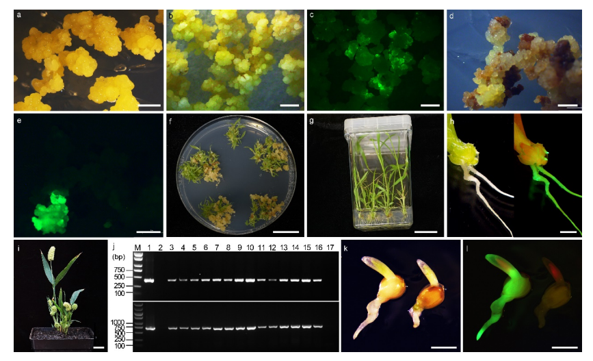 研究者對各種因素進行了測試,以開發(fā)出適合“小米”的農(nóng)桿菌介導的轉(zhuǎn)化方案。并挑戰(zhàn)使用成熟種子作為愈傷組織誘導的起始材料,以避免在使用新鮮組織(如幼花序或未成熟胚)誘導愈傷組織時的昂貴需求。在改良的愈傷組織誘導培養(yǎng)基(CIM)上進行三輪繼代培養(yǎng)后,獲得了致密的胚性愈傷組織(圖8a)。通過使用綠色熒光蛋白(GFP)報告基因來監(jiān)測農(nóng)桿菌感染效率,如圖8b、c所示,以及篩選轉(zhuǎn)基因愈傷組織的有效性?!靶∶住钡脑偕芰υ贑IM培養(yǎng)基上保持良好(圖8f)。表達GFP的轉(zhuǎn)基因植株在生根培養(yǎng)基上容易誘導生根,移栽到土壤后成活良好(圖8g-i)。