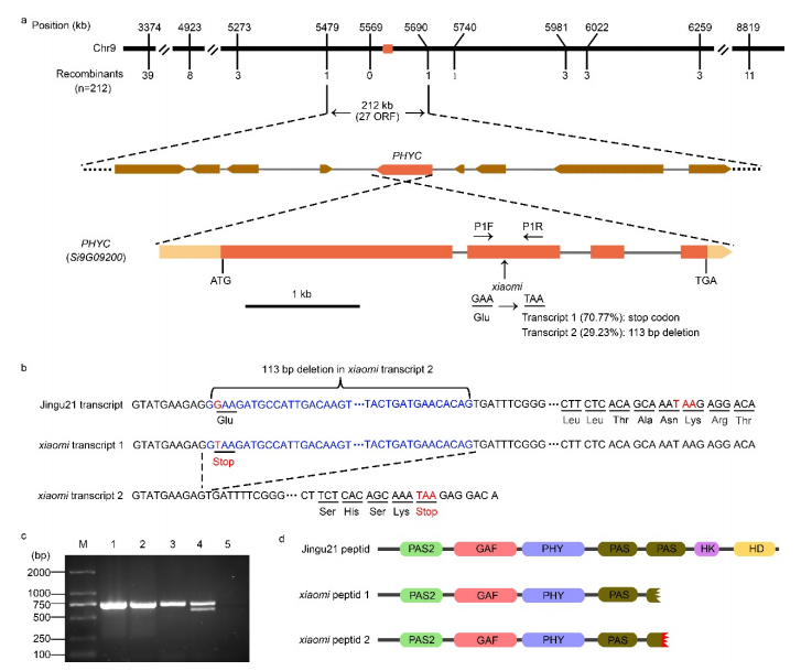 將“小米”基因組序列與經(jīng)基因組重測序生成的晉谷21基因組序列進行比較,發(fā)現(xiàn)在定位區(qū)域只存在一個突變——“小米”基因Si9g09200的編碼區(qū)從“G”到“T”的突變,該基因編碼一種假定的PHYC蛋白(圖2a)。在所檢測的77個早期抽穗F2個體中,均為T/T純合突變體。相比之下,在256個晚抽穗個體中,92個是G/G WT純合子,另外164個是G/T雜合子,反映了基因型和表型之間的完美關(guān)聯(lián)。這種突變產(chǎn)生了一個終止密碼子,形成一個截短的蛋白質(zhì),占該基因約71%的轉(zhuǎn)錄本(轉(zhuǎn)錄本1)(圖2a-d)。這一突變還導致了113 bp的移碼缺失的剪接,形成了占該基因約29%轉(zhuǎn)錄本(轉(zhuǎn)錄本2)的截短蛋白(圖2a-d)。根據(jù)預測,被截斷的蛋白質(zhì)缺少第二個PAS結(jié)構(gòu)域的三分之二(肽1)或三分之一(肽2),以及整個HK和HD域(圖2d)。