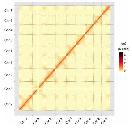 為了便于“小米”作為模型植物的使用,使用PacBio平臺組裝出429.94 Mb基因組 v1.0(k-mer預估438.26 Mb),contig N50高達18.8?Mb,Scaffold N50為42.41 Mb,并且僅包含48個Gap。其中399.4 Mb通過Hi-C錨定在9條染色體上(掛載率~93%;圖5)。根據(jù)Illumina DNA比對,組裝的錯誤率約為0.001%(每100kb有一個錯誤)。BUSCO評估結(jié)果為97.78%。這些結(jié)果表明“小米”基因組v1.0可以作為研究界的金標準參考。
