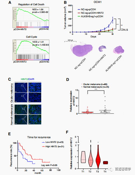 在眼黑色素瘤細(xì)胞中,在mRNA水平和蛋白水平均過表達(dá)HINT2。發(fā)現(xiàn)過表達(dá)HINT2后,眼黑色素瘤細(xì)胞的細(xì)胞增殖、細(xì)胞遷移、和克隆形成明顯受到抑制,細(xì)胞凋亡增加。此外,GSEA顯示在腫瘤細(xì)胞中HINT2促進(jìn)凋亡和細(xì)胞死亡(Fig3a)。為了確定HINT2在體內(nèi)腫瘤特征中的作用,過表達(dá)HINT2的眼黑色素瘤細(xì)胞進(jìn)行了皮下移植。結(jié)果顯示:相對于對照組(Fig3b, A組)來說,實(shí)驗(yàn)組HINT2過表達(dá)組(Fig3b, B組)腫瘤體積持續(xù)降低。為了研究這些蛋白表達(dá)的變化是否在樣本中發(fā)生,在眼黑色素瘤和正常組織中進(jìn)行IF實(shí)驗(yàn)(Fig3c),發(fā)現(xiàn)HINT2確實(shí)在腫瘤樣本中下調(diào)。除此之外,在眼黑色素瘤組織樣本中,低表達(dá)的HINT2與不良預(yù)后高度相關(guān)(Fig3e)。