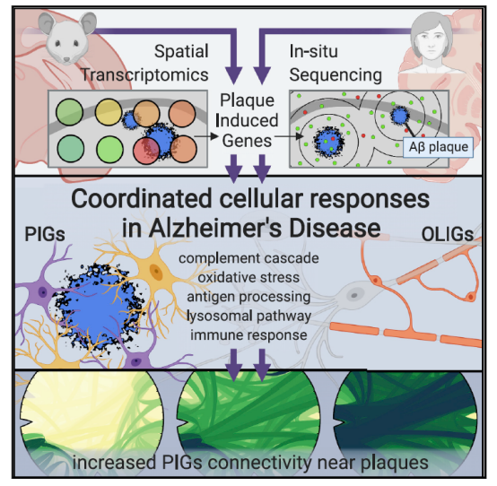 本文使用空間轉(zhuǎn)錄組在數(shù)百個(gè)微小組織區(qū)域(TDs)進(jìn)行原位測(cè)序,發(fā)現(xiàn)了淀粉樣蛋白斑誘導(dǎo)的全基因組轉(zhuǎn)錄組改變。同時(shí)使用正交的原位測(cè)序方法在單細(xì)胞水平分析了數(shù)百個(gè)重要基因。進(jìn)而繪制了響應(yīng)Aβ沉積的兩個(gè)基因共表達(dá)網(wǎng)絡(luò)—-PIGs和OLIG。分析數(shù)據(jù)發(fā)現(xiàn)淀粉樣蛋白斑并不是簡(jiǎn)單的“發(fā)病結(jié)果”,還會(huì)誘導(dǎo)一系列的基因變化 ,影響疾病進(jìn)展。