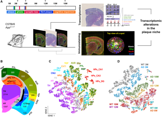 作者使用3、6、12、18月齡的AppNL-G-F和C57BL/6小鼠大腦進(jìn)行冷凍切片,每只切三片,外側(cè)做免疫組化,中間做ST(圖1A)。每個(gè)冠狀切面包含500多個(gè)TDs的轉(zhuǎn)錄譜,20個(gè)切片合計(jì)10327個(gè)轉(zhuǎn)錄譜。并對(duì)每個(gè)TD進(jìn)行了空間、病理和細(xì)胞信息的注釋。實(shí)驗(yàn)中每個(gè)TD檢測(cè)到31283± 7,441個(gè)唯一分子標(biāo)簽和6,578 ± 987唯一基因。作者將每個(gè)冠狀切片與艾倫小鼠大腦圖譜鑒定的14個(gè)解剖大腦區(qū)域進(jìn)行匹配(圖1B),并且每一個(gè)TD都被分配其中。TDs的數(shù)量介于112(內(nèi)嗅皮層ENTI)和2114(丘腦TH)之間(圖1B)。最后將三張切片整合,用Aβ負(fù)荷(6E10染色)、反應(yīng)星形膠質(zhì)細(xì)胞(GFAP)、神經(jīng)元(NeuN)以及細(xì)胞核(DAPI)對(duì)其進(jìn)行注釋。
