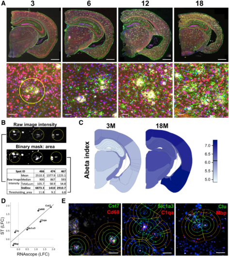 為了解基因表達(dá)的變化,作者進(jìn)行了兩個(gè)差異表達(dá)分析。首先比較AppNL-G-F?和 C57BL/6(基因模型),其次是Aβ沉積對(duì)基因表達(dá)的影響(Aβ模型)。作者使用6個(gè)轉(zhuǎn)錄本進(jìn)行經(jīng)典的RNA原位雜交實(shí)驗(yàn)來(lái)驗(yàn)證Aβ模型(圖2D&E),根據(jù)模型,18月齡的AppNL-G-F,Cst7,Cd68,C1qa,Slc1a3,Clu和Mbp表達(dá)異常。在圖2D中可以看到,ST的數(shù)據(jù)和RNA原位雜交數(shù)據(jù)高度相關(guān),這也證實(shí)了本方法的有效性。
