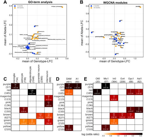 具有相似表達(dá)模式的基因很可能擁有相似的功能,因此可以通過(guò)加權(quán)基因共表達(dá)網(wǎng)絡(luò)分析(WGCNA)進(jìn)行模塊聚類。作者研究了10327個(gè)轉(zhuǎn)錄譜中變化程度*大的50%的基因,識(shí)別出12個(gè)模塊,并使用GOrilla提取了可能的生物學(xué)功能、Aβ暴露的表達(dá)變化、3月齡和18月齡的基因型、細(xì)胞特征、受影響的腦區(qū)。
