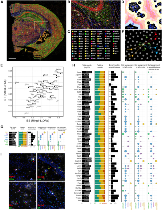 ST展示了淀粉樣蛋白斑周圍的多細(xì)胞反應(yīng),作者尋求一種正交獨(dú)立方法從單細(xì)胞分辨率下進(jìn)行驗(yàn)證。原位測(cè)序(ISS)可以在一個(gè)反應(yīng)中使用許多靶向特異的原位標(biāo)簽。作者使用了特制的探針來(lái)繪制PIGs表達(dá)以及細(xì)胞類型標(biāo)簽(Itgam、 Cx3cr1、Csf1r對(duì)應(yīng)小膠質(zhì)細(xì)胞;Slc1a3、Gfap 、Clu對(duì)應(yīng)星形膠質(zhì)細(xì)胞; Syp對(duì)應(yīng)神經(jīng)元; Plp1對(duì)應(yīng)少突膠質(zhì)細(xì)胞;圖4A-C)。ISS實(shí)驗(yàn)中,對(duì)AppNL-G-F和兩只18月齡WT小鼠各構(gòu)建兩個(gè)文庫(kù)。用每個(gè)基因的熒光點(diǎn)數(shù)目來(lái)量化基因表達(dá),并將熒光點(diǎn)聚類到淀粉樣蛋白斑周位的5個(gè)同心圓上(圖4D)。51/54個(gè)PIGs在圈1上明顯富集,而C1qb在圈1上明顯減少(圖4E)。ISS的結(jié)果與ST的結(jié)果線相關(guān)性非常好(圖4E)。