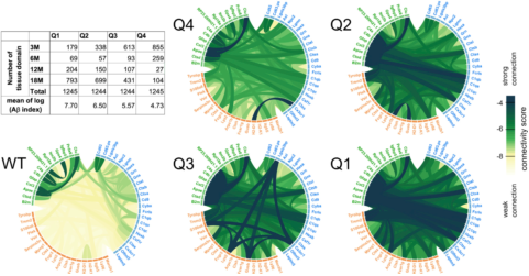 在WT中,所有PIGs的關(guān)聯(lián)相對(duì)較低,PIG被分為三個(gè)簇(圖5,綠、藍(lán)、橙)。ISS實(shí)驗(yàn)(圖4H)證明了在綠色簇中,星形膠質(zhì)細(xì)胞基因(7/12)富集,而藍(lán)色(14/23)和橙色(14/28)簇聚集了小膠質(zhì)基因中表達(dá)的PIGs。在WT中,橙色的PIGs幾乎不關(guān)聯(lián),而AppNL-G-F小鼠中,在接觸增長(zhǎng)的Aβ后,這些PIGs的基因被招募。隨著Aβ指標(biāo)增長(zhǎng),PIGs內(nèi)部和相互之間的關(guān)聯(lián)增強(qiáng)。在Q4-Q1中,隨蛋白斑積累程度增加,互作關(guān)系明顯增加。