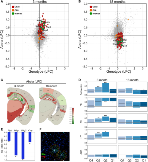作者進(jìn)而更詳細(xì)地從Aβ指標(biāo)和OLIG表達(dá)的關(guān)系方面分析這些區(qū)域的不同。在圖2中,Aβ沉積隨疾病的進(jìn)展而不同。甚至在3個(gè)月時(shí),有些TDs暴露于Aβ(圖5,Q1中179個(gè)TDs)。隨著Q4-Q2中TDs的Aβ緩慢增長(zhǎng),OLIG表達(dá)增加(圖6D)。但是,三月齡有著*高Aβ暴露(Q1,比Q4中Aβ高21倍)的TDs中OLIG的表達(dá)存在一種降低的趨勢(shì)。另外,低Aβ暴露的TDs中OLIG模塊的基因?qū)Φ倪B接強(qiáng)度之和*強(qiáng)。為了進(jìn)一步證明發(fā)現(xiàn),作者對(duì)三月齡AppNL-G-F小鼠的整個(gè)冠狀切片,設(shè)計(jì)四個(gè)OLIGs(Plp1、Mbp、Olig2和Cnp)探針做RNA原位雜交(圖6E&F)。結(jié)果顯示,在三月齡小鼠稠密的淀粉樣蛋白斑周圍,這4個(gè)OLIGs明顯減少。可以推測(cè),在輕度Aβ暴露下,OLIG模塊高表達(dá)和相互連接,但在高密度Aβ積累的微環(huán)境中表達(dá)減少。因此,部分OLIG模塊的區(qū)域差異與不同的Aβ暴露有關(guān)。