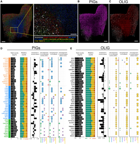 作者使用3名AD患者和3名正常對(duì)照組死后的人腦樣本進(jìn)行實(shí)驗(yàn)。AD大腦處于淀粉蛋白斑C階段和神經(jīng)元糾纏V-VI階段的疾病進(jìn)展期。研究描繪了與AD相關(guān)的額上回組織譜,總共報(bào)告了222個(gè)基因表達(dá)譜,包括45個(gè)人PIGs同源序列,OLIG模塊中42個(gè)斑塊反應(yīng)基因的同源序列,以及一系列細(xì)胞類型Marker。這些細(xì)胞Marker很好地在細(xì)胞分辨率下描繪了大腦區(qū)域(圖7A)。PIG模塊(圖7B,紫色)和OLIG模塊(圖7C,紅色)基因如預(yù)期的在大腦灰質(zhì)和白質(zhì)中富集。