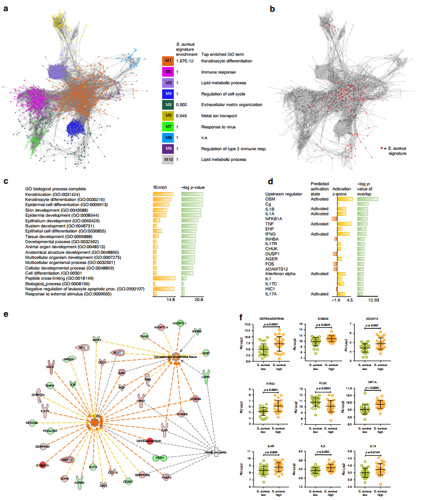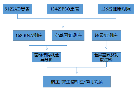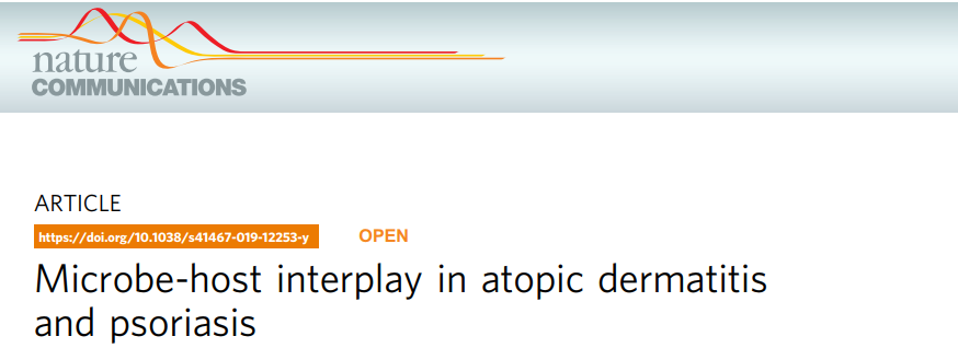 本文通過16S RNA測序、宏基因組測序及轉(zhuǎn)錄組測序技術(shù)研究了特異性皮炎和銀屑病患者皮膚微生物群落結(jié)構(gòu)以及皮膚基因表達(dá)模式。發(fā)現(xiàn)特異性皮炎和銀屑病與健康對照皮膚微生物組成存在顯著差異。特異性皮炎以金黃葡萄球菌為主并與宿主皮膚屏障功能、色氨酸代謝和免疫激活相關(guān)。銀屑病皮膚微生物群落與宿主基因表達(dá)存在微弱的關(guān)聯(lián)性。并為皮膚生態(tài)失調(diào)的生物標(biāo)志物和靶向治療提供基礎(chǔ)。