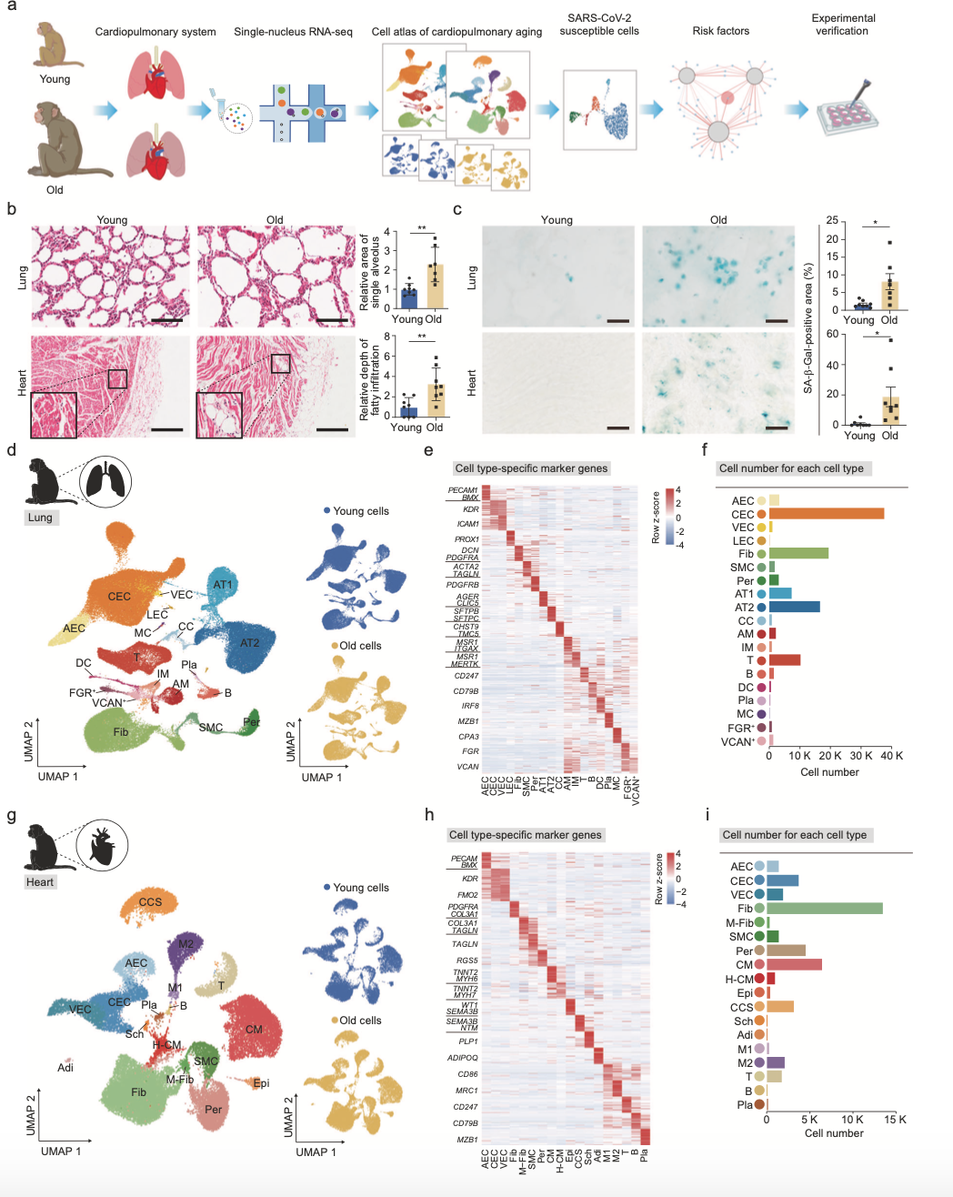 分別對(duì)兩組樣品選取肺和心臟組織進(jìn)行單細(xì)胞核測(cè)序(圖1a)。與幼齡猴肺相比,老年猴肺的特征是肺泡增大、纖維化增加和脂肪沉積(圖1b)。此外,在老年猴心臟中出現(xiàn)脂肪浸潤(rùn)。同時(shí),衰老的肺和心臟表現(xiàn)出較高水平的半乳糖苷酶(SA-β-Gal)染色,而這個(gè)是細(xì)胞衰老的特征(圖1c)。通過單細(xì)胞核測(cè)序,共獲得150000個(gè)細(xì)胞,利用UMAP聚類分析,鑒定了具有不同細(xì)胞特征的19中肺細(xì)胞和18中心臟細(xì)胞。利用已知細(xì)胞特征進(jìn)行再次鑒定,在肺中,鑒定到了AT1和AT2、纖毛細(xì)胞(CCs)、內(nèi)皮細(xì)胞等,并鑒定出7中免疫細(xì)胞,包括AMs、IMs、B細(xì)胞、T細(xì)胞等(圖1d)。在心臟中,鑒定了肥厚性心肌細(xì)胞(H-CMs)、心外膜細(xì)胞、兩種神經(jīng)傳導(dǎo)細(xì)胞等,并鑒定出5種免疫細(xì)胞(圖1g)。通過GO數(shù)據(jù)庫注釋和轉(zhuǎn)錄組分析顯示,細(xì)胞類型在靈長(zhǎng)類動(dòng)物衰老過|中沒有明顯影響。研究顯示作者的數(shù)據(jù)代表了年輕和年老靈長(zhǎng)類動(dòng)物肺和心臟的單核細(xì)胞轉(zhuǎn)錄圖譜。