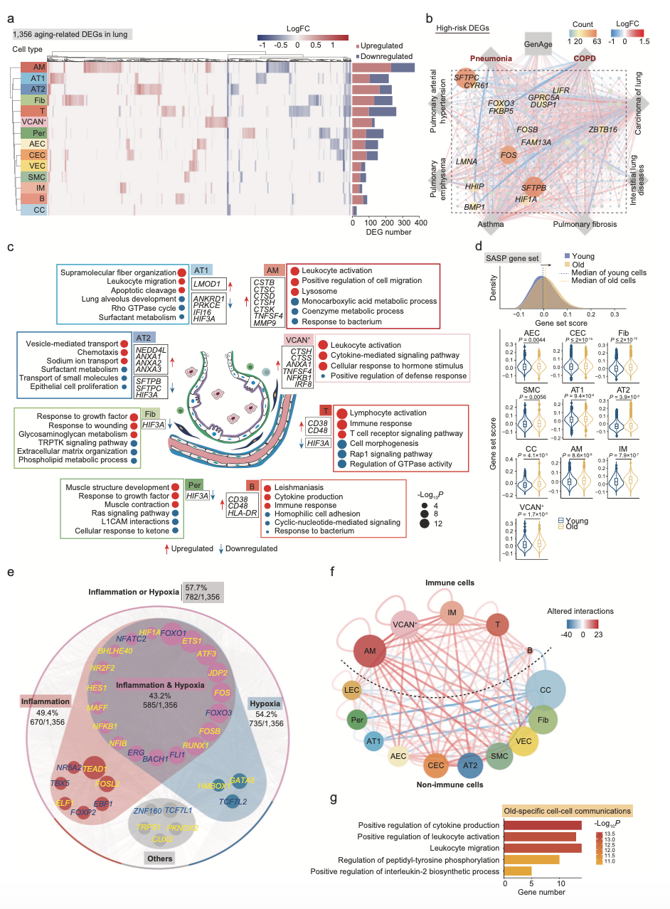 為了闡明細(xì)胞水平上與衰老相關(guān)的分子機(jī)制,作者在個(gè)性肺細(xì)胞中識(shí)別和衰老相關(guān)的轉(zhuǎn)錄組變化。通過差異分析(| logFoldChange(logFC)| 0.25,調(diào)整后的P值<0.05)顯示,共獲得1356個(gè)差異基因(圖2a)。衰老過程中受影響最大的細(xì)胞包括AMs、T細(xì)胞、成纖維細(xì)胞、AT1和AT2,在老年和青年肺亞型中分別有372、262、239、235和217個(gè)差異基因。通過數(shù)據(jù)庫注釋,這些基因包含了肺部疾?。–OPD、肺炎、肺纖維化、哮喘等)的熱點(diǎn)基因。下調(diào)的DEGs參與上皮細(xì)胞增值、止血和表面活性物質(zhì)代謝(圖2c),提示衰老過程中肺功能受損。此外,SASP相關(guān)基因在10中類型細(xì)胞中過表達(dá)(圖2d),表明老年肺以細(xì)胞應(yīng)激和慢性炎癥為特征。具體來說,上調(diào)的DEGs與囊泡介導(dǎo)的轉(zhuǎn)運(yùn)有關(guān)(圖2c),這可能構(gòu)成病毒內(nèi)化的一個(gè)貢獻(xiàn)者。在蛋白水平上,通過免疫熒光分析證實(shí)了缺氧誘導(dǎo)的轉(zhuǎn)錄因子HIF1在老年肺中表達(dá)上調(diào),提示老年肺可能發(fā)生明顯的缺氧應(yīng)激反應(yīng),這可能是導(dǎo)致深度衰老的原因之一。通過上皮細(xì)胞和免疫細(xì)胞的轉(zhuǎn)錄特征分析,觀察到21個(gè)囊泡介導(dǎo)的轉(zhuǎn)運(yùn)相關(guān)基因在AT2細(xì)胞中,這可能與病毒的進(jìn)入、組裝等相關(guān)。因此,這些結(jié)果揭示了衰老可能導(dǎo)致肺泡上皮屏障功能衰退以及病毒防御能力受損。