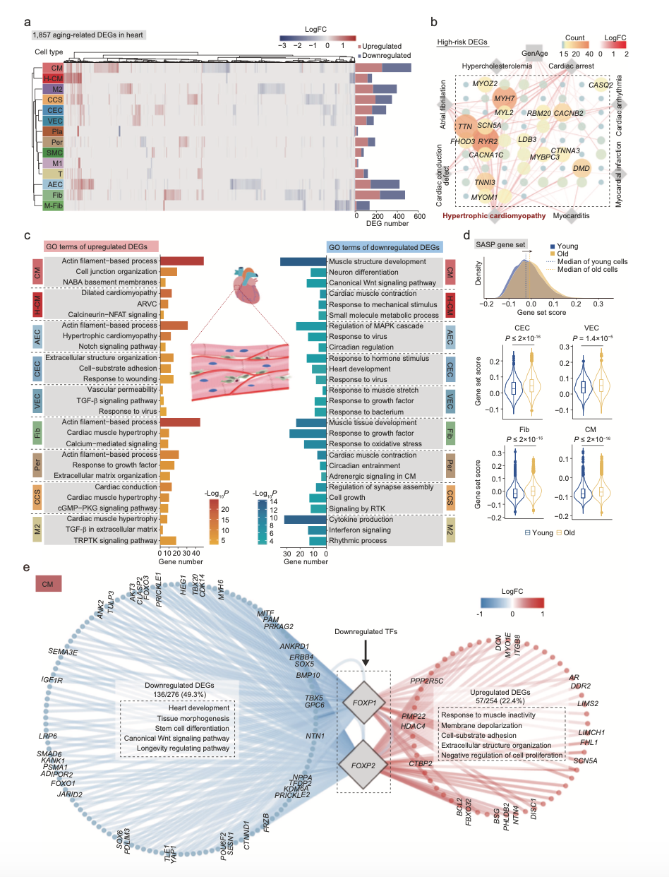 總的來說,老年肺組織中許多免疫細(xì)胞類型的比例增加,包括肥大性細(xì)胞和漿細(xì)胞,他們分泌細(xì)胞因子和抗體導(dǎo)致年齡相關(guān)性炎癥、慢阻肺病和肺纖維化的比例增加。 為了探索衰老心臟中細(xì)胞特異性的分子機(jī)制,作者篩選出了1857個(gè)差異基因(|logFC| > 0.25, P value < 0.05)(圖3a),其中數(shù)十個(gè)基因是肥厚型心肌病的熱點(diǎn)基因(圖3b)。反映了心臟中與年齡相關(guān)的基因表達(dá)變化與老年人心臟病高發(fā)之間的緊密聯(lián)系。