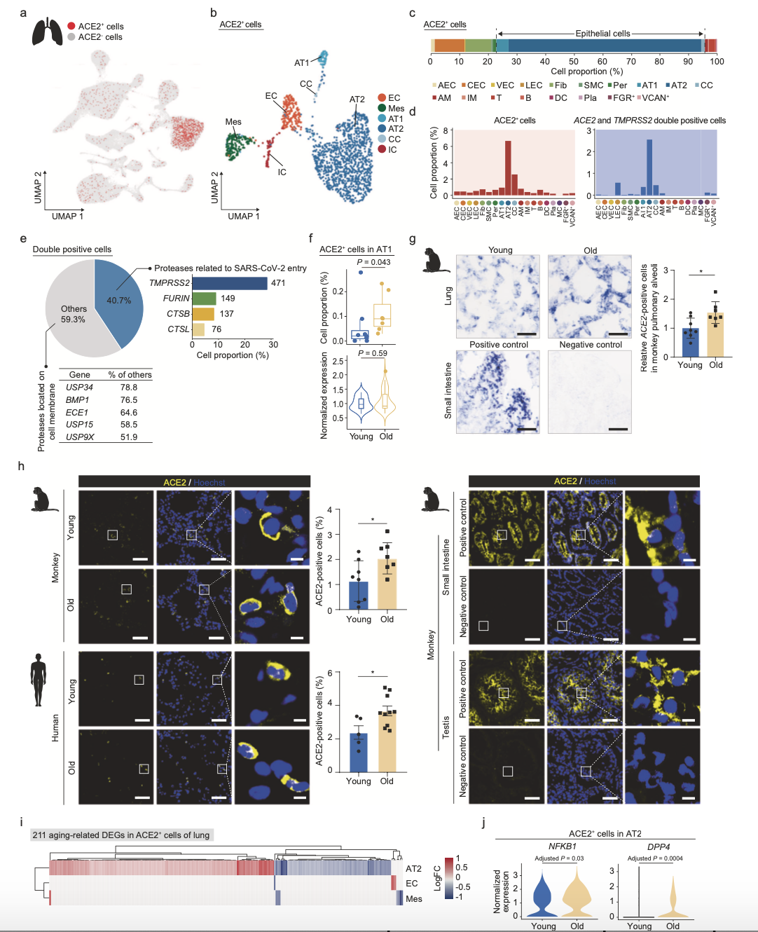 為了識(shí)別可能被SARS-CoV-2靶向的細(xì)胞類型,作者分析了ACE2、TMPRSS2、FURIN和其他可能的輔助蛋白的細(xì)胞特異性的表達(dá)模式。在肺中,ACE2在AT2(7%)、AT1(1%)、纖毛細(xì)胞(3%)等類型中表達(dá)(圖4b-d),另外還發(fā)現(xiàn),一小部分內(nèi)皮細(xì)胞表達(dá)ACE2、AECs、CECs均表達(dá)為0.2%,AT2和AT1中檢測(cè)到大多數(shù)ACE2和TMPRSS2雙陽性細(xì)胞。組織蛋白酶家族成員的FURIN、CTSB、CTSL等膜錨定蛋白酶與ACE2共表達(dá)。這些數(shù)據(jù)確認(rèn)AT2和AT1是肺中COVID-19的易感細(xì)胞類型。有趣的是,衰老細(xì)胞中ACE2陽性的AT1細(xì)胞比例增加了約2倍。更重要的是,衰老過程中,NHP和人肺部的免疫染色均證實(shí)了肺泡周圍ACE2陽性細(xì)胞的增加,提示隨著年齡的增長(zhǎng),肺泡表面更容易感染SARS-CoV-2的細(xì)胞比例增加。