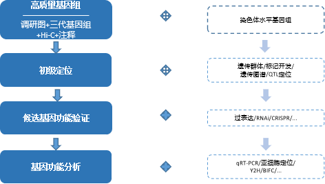 遺傳圖譜是目前經(jīng)典的功能基因定位策略,主要基于高通量測(cè)序技術(shù)開發(fā)單核苷酸多態(tài)性位點(diǎn)(SNP),并計(jì)算多態(tài)性標(biāo)記間的遺傳連鎖距離,構(gòu)建高密度遺傳圖譜,最后結(jié)合性狀調(diào)查對(duì)目標(biāo)區(qū)域進(jìn)行定位。數(shù)量性狀基因座(quantitative trait locus,QTL)是指基因組中引起數(shù)量性狀變異的座位。作物的產(chǎn)量、質(zhì)量、株型、生長(zhǎng)發(fā)育等大多數(shù)重要經(jīng)濟(jì)性狀及農(nóng)藝性狀通常都為數(shù)量性狀。利用分子標(biāo)記,通過連鎖分析進(jìn)行QTL定位,是遺傳學(xué)中研究數(shù)量性狀相關(guān)功能基因的基本手段和確定分離并分離目標(biāo)基因的前提。而優(yōu)質(zhì)的基因組才能為性狀精準(zhǔn)定位提供有力支持。
