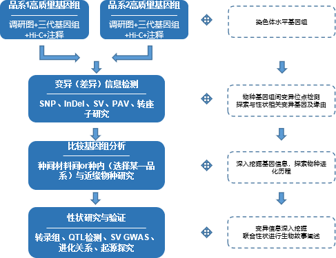 對(duì)于大部分動(dòng)植物,其測(cè)序主要基于單一品種作為參考基因組。單一基因組測(cè)序通常只能覆蓋基因組的80%~90%,且通常只有代表馴化的優(yōu)良品種的單一基因型能夠被準(zhǔn)確檢測(cè)到,因此不同生態(tài)型重測(cè)序數(shù)據(jù)一般只有50%~80%能比對(duì)到參考基因組上。而通過對(duì)兩種品系基因組進(jìn)行denovo(或者與已發(fā)表品系進(jìn)行研究),充分比較其間的基因組變異信息,可以更好的對(duì)不同生態(tài)型進(jìn)行表型功能差異分析。結(jié)合兩種生態(tài)型品種雜交子代圖譜,將極大的利于后續(xù)性狀與功能研究。與動(dòng)物相比植物更具有品種多樣性,因此該研究方案目前更多的應(yīng)用于植物材料中。
