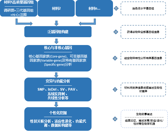而親緣關(guān)系較近的種間材料同樣可以分別進(jìn)行denovo,并通過其間的變異分析掌控物種間的起源進(jìn)化及功能關(guān)系。