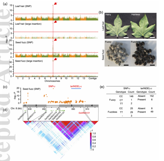 本研究中,作者利用215份亞洲棉自然群體,在前人基于SNP標(biāo)記的GWAS基礎(chǔ)上(Du et al.?2018),基于SV(結(jié)構(gòu)變異)標(biāo)記對種子短絨和葉茸毛性狀進行GWAS,鑒定得到位于A08染色體末端的一個非編碼插入片段larINDELFZ與短絨和葉茸毛表型顯著相關(guān)(圖1a, b);連鎖不平衡分析發(fā)現(xiàn),在關(guān)聯(lián)區(qū)域有4個連鎖不平衡(LD)位點,SNPFZ不位于這些位點內(nèi)(圖1c, d);對SNPFZ和larINDELFZ基因型與種子短絨的相關(guān)性進行研究,發(fā)現(xiàn)只有l(wèi)arINDELFZ基因型與無茸毛表型高度相關(guān)(圖1e)。以上結(jié)果表明,插入片段larINDELFZ與種子短絨和葉茸毛性狀顯著相關(guān)。