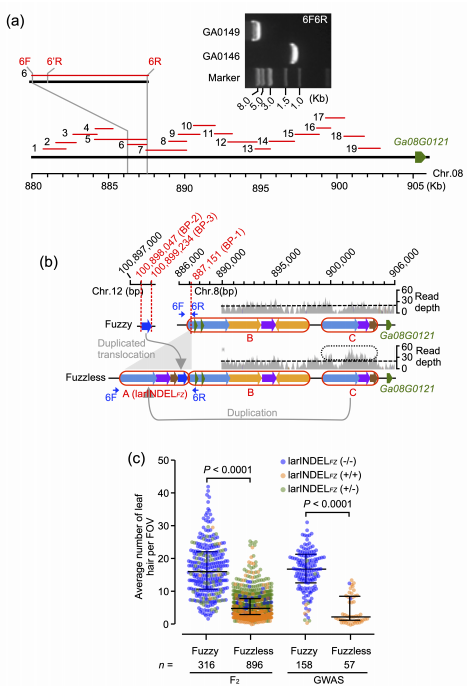 為了驗證插入片段larINDELFZ,作者利用19個重疊引物在具有代表性的短絨和無絨材料(GA0146和GA0149)中進行序列分析,發(fā)現(xiàn)短絨材料中有一個大小為6226 bp的插入片段larINDELFZ(圖2a);進一步分析發(fā)現(xiàn),該插入片段由一個約5?kb的重復(fù)序列和一個約1.2?kb的易位片段組成(圖2b);作者在GWAS群體以及GA0146和GA0149構(gòu)建的包含1212單株的F2群體中分析larINDELFZ和表型的相關(guān)性,結(jié)果表明,位于亞洲棉第8染色體上的6226?bp的larINDELFZ與種子短絨和葉茸毛顯著相關(guān)(圖2c)。
