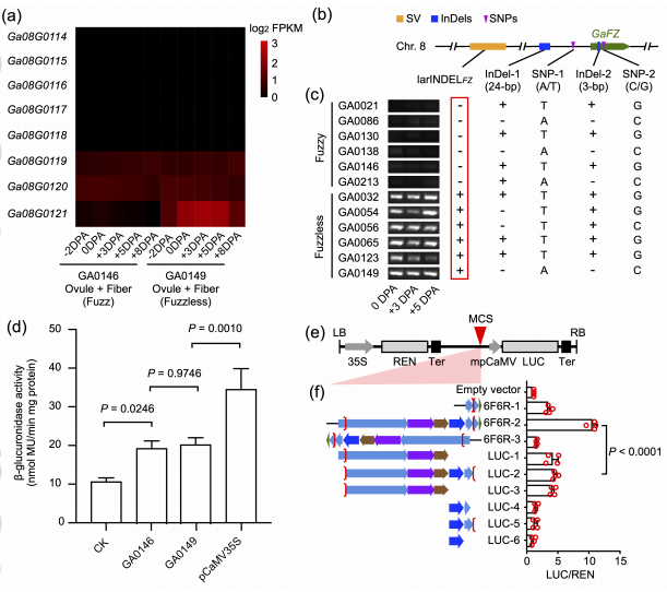 作者對關(guān)聯(lián)區(qū)域內(nèi)8個基因的表達模式分析,發(fā)現(xiàn)在短絨發(fā)育起始階段,無絨材料中GaFZ基因表達顯著高于短絨材料(圖3a);從GWAS群體中隨機挑選各6個短絨和無絨材料進行基因和啟動子序列分析,發(fā)現(xiàn)larINDELFZ存在于所有的無絨材料中(圖3b, c);熒光素酶活性分析實驗結(jié)果表明,larINDELFZ可能扮演遠端增強子角色特異激活其下游短絨發(fā)育關(guān)鍵基因的GaFZ?表達(圖3d, e)