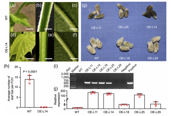 為了進一步驗證GaFZ基因的功能,作者分別在擬南芥和有短絨的陸地棉中過表達GaFZ基因,發(fā)現(xiàn)轉(zhuǎn)基因擬南芥葉茸毛的發(fā)育收到了明顯的抑制,同時轉(zhuǎn)基因棉花株系的莖毛、葉茸毛和短絨的發(fā)育也均受到了不同程度的抑制(圖a-h);但是,轉(zhuǎn)基因棉花和擬南芥中根毛的數(shù)量均沒有發(fā)生變化;qRT-PCR分析顯示,過表達株系中GaFZ基因顯著高于野生型(圖4i-j);結(jié)果表明,GaFZ基因可以抑制葉茸毛和短絨纖維的發(fā)育,而對根毛的發(fā)育沒有抑制作用。
