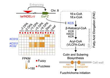 作者進一步在短絨和無絨棉花材料和過表達的擬南芥材料中分析全基因共表達譜,在擬南芥和棉花的短絨關(guān)鍵發(fā)育階段,共鑒定出1343個和367個差異表達基因,這些基因主要參與次生代謝,如脂肪酸伸長和角質(zhì)、栓質(zhì)和蠟質(zhì)的生物合成;結(jié)合互作分析發(fā)現(xiàn),GaFZ基因可能通過抑制超長鏈脂肪酸伸長途徑中關(guān)鍵基因的表達,進一步抑制脂肪酸延伸的下游途徑,從而影響短絨/葉茸毛的發(fā)育。作者基于基因功能分析,提出了一個亞洲棉短絨發(fā)育的可能機制(圖5)。