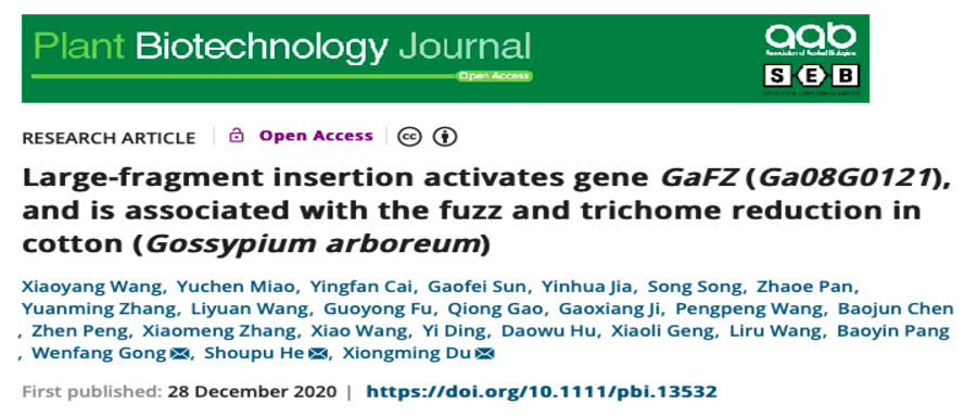 棉花是重要的天然纖維經(jīng)濟作物,在全球廣泛種植。今天給大家推薦的這篇文章是近日中棉所杜雄明老師團隊與河南大學(xué)苗雨晨、蔡應(yīng)繁老師團隊合作解析的研究成果“Large-fragment insertion activates gene?GaFZ?(Ga08G0121), and is associated with the fuzz and trichome reduction in cotton (Gossypium arboreum)”,該研究報道了一個新的棉花種子短絨/葉茸毛調(diào)控因子,并闡述其遺傳機制,最終該成果發(fā)表在國際知名期刊Plant Biotechnology Journal(IF=8.154)。