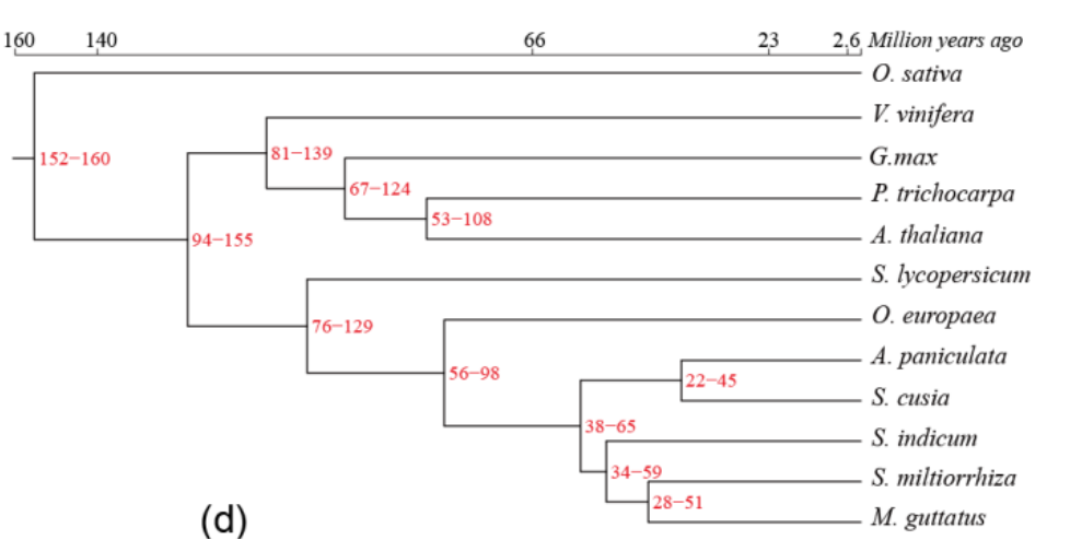 通過與其它種基因組進(jìn)行比較,挖掘不同種間的系統(tǒng)進(jìn)化關(guān)系。根據(jù)各類生物間的親緣關(guān)系的遠(yuǎn)近,把各類生物安置在有分枝的樹狀的圖表上,簡(jiǎn)明地表示生物的進(jìn)化歷程和親緣關(guān)系。借助于化石時(shí)間矯正,可以得到有分化時(shí)間的物種樹,從而獲得物種之間的親緣關(guān)系和分歧時(shí)間,有利于闡明物種的進(jìn)化歷史。?