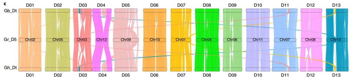 如2018年百邁客合作發(fā)表于《Nature Genetics》陸地棉與海島棉基因組文章圖例所示:海島棉染色體D05和陸地棉D(zhuǎn)12中均存在大的染色體臂間倒位,暗示這些變異出現(xiàn)在多倍化之后;兩個(gè)四倍體相對(duì)于G. raimondii共有一些結(jié)構(gòu)變異,例如染色體D09中兩個(gè)四倍體發(fā)生了大的反轉(zhuǎn)。?
