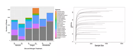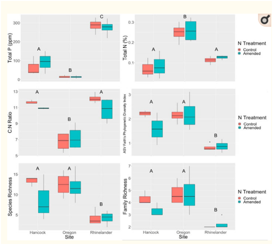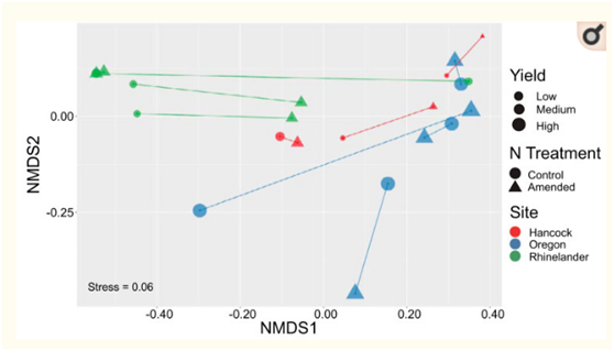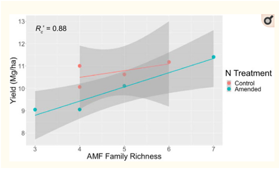 在包括施氮處理在內(nèi)的線性混合效應(yīng)回歸模型中,AMF的?ASV多樣性指標(biāo)不能顯著預(yù)測(cè)任何地點(diǎn)的柳枝稷產(chǎn)量。在科水平上,AMF豐富度是俄勒岡地塊產(chǎn)量的邊際顯著預(yù)測(cè)因子;俄勒岡地區(qū)AMF群落中科水平的豐富度越高,柳枝稷產(chǎn)量就越高,表明隨著AMF家族的豐富,柳枝稷可能由于AMF功能互補(bǔ)而受益于更大的多樣性。