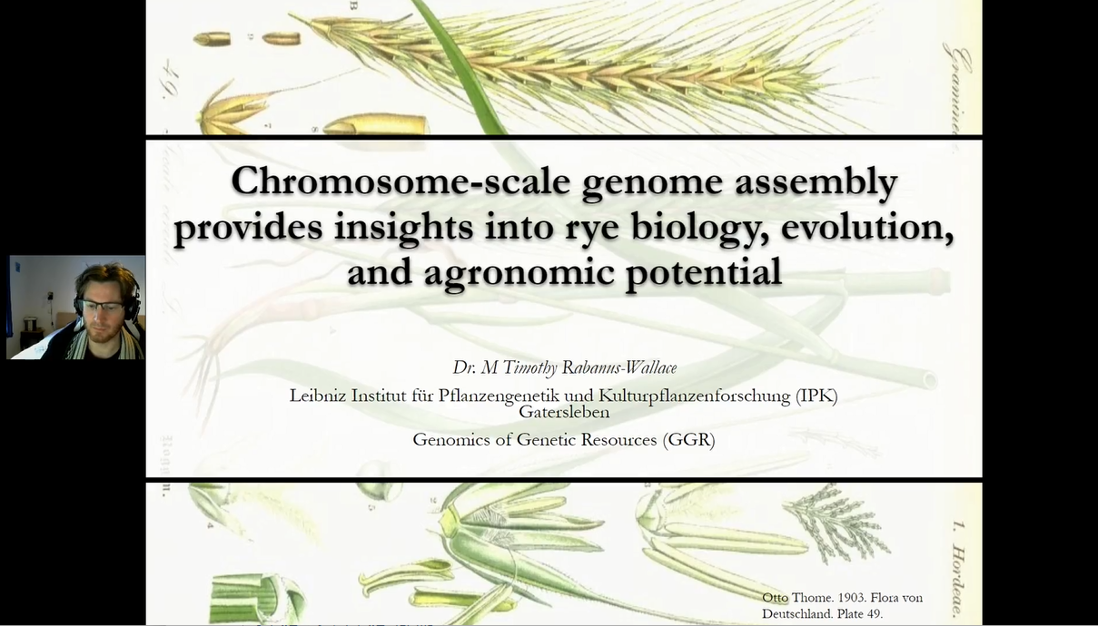 德國(guó)萊布尼茨植物遺傳與作物研究所Timothy Rabanus-Wallace 博士講述了黑麥基因組破譯所面臨的挑戰(zhàn),并細(xì)致全面的講述了本次研究聯(lián)合短讀長(zhǎng)、Hi-C、10×Genomics、遺傳圖譜及光學(xué)圖譜等技術(shù)如何破譯歐洲栽培黑麥“Lo7”基因組。解析了黑麥基因間空間的演化,以及抗病、抗寒與自交不親和等生物學(xué)過(guò)程的發(fā)生與作用機(jī)制,揭示了黑麥易位染色體片段對(duì)小麥遺傳改良的重要作用。Timothy 博士表示,未來(lái)可以基于品種間Hi-C基因組定位,在威寧黑麥和Lo7基因組間進(jìn)行系統(tǒng)的結(jié)構(gòu)比較,研究不同品系黑麥基因組間的大片段結(jié)構(gòu)變異。