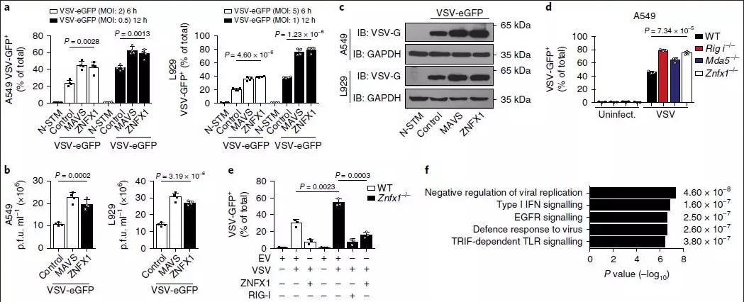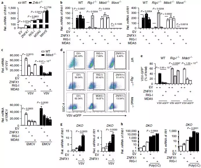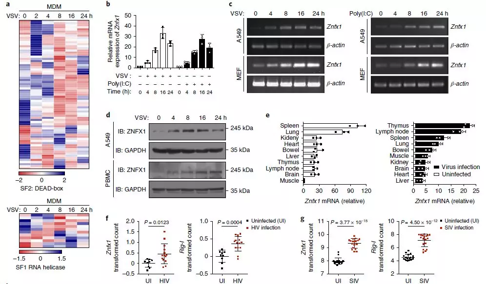 為了更深入地了解ZNFX1在抗病毒應答中的作用,進行了qRT-PCR或免疫印跡分析,以了解VSV感染或干擾素誘導劑聚肌胞苷酸(poly(I:C))刺激A549細胞、外周血單個核細胞(PBMC)或小鼠胚胎成纖維細胞(MEF)細胞后ZNFX1的表達上調(圖1b–d)。qRT-PCR也證實了靜脈注射VSV后小鼠脾臟和肺中Znfx1的豐度上調(包括胸腺、淋巴結脾臟和肺)(圖1e)。作者還對先前收集的芯片數(shù)據(jù)集(GDS4231/4214/1271/3210/6082/6063)進行了統(tǒng)計分析,發(fā)現(xiàn)與健康對照相比,在HIV感染患者和猿猴免疫缺陷病毒(SIV)引起的腦炎猴子中,Znfx1的RNA水平明顯更高(圖1f,g)。此外,在不同的細胞類型(包括巨噬細胞、樹突狀細胞和上皮細胞)中感染病毒后,Znfx1的轉錄顯著增加。這些數(shù)據(jù)都表明ZNFX1可能是抗病毒分子。