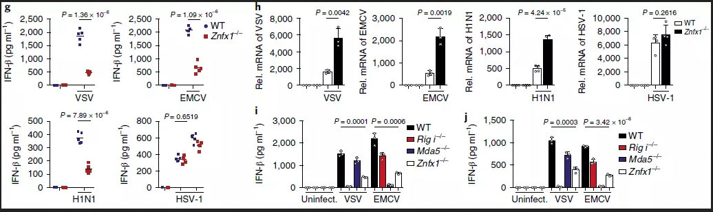 為了研究ZNFX1在體內的生理作用,使用CRISPR/Cas系統(tǒng)生成了Znfx1-/-C57BL/6J小鼠。Znfx1-/-小鼠存活,沒有明顯的生理或行為異常。在這項研究中使用了六至八周大的小鼠。首先,分離野生型和Znfx1-/-小鼠的BMDM并用VSV、EMCV、H1N1或HSV-1感染,與野生型相比,Znfx1-/-BMDM的IFN-α或IFN-β分泌較低。RNA病毒感染后,包括VSV、EMCV和H1N1,但不包括HSV-1(圖2g),Znfx1-/-BMDM中檢測到較高的病毒mRNA水平,但在HSV-1感染的細胞中未檢測到較高的病毒mRNA水平(圖2h)。與野生型相比,Znfx1-/- MEF和A549細胞在RNA病毒感染VSV和EMCV后表現(xiàn)出較低的IFN-β分泌(圖2i,j)。