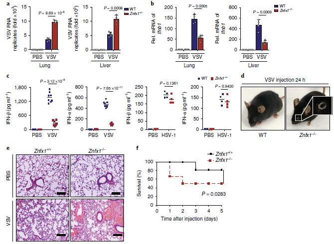 ZNFX1在宿主體內對抗病毒感染的防御中的重要性:通過尾靜脈向野生型和Znfx1-/-小鼠注射了VSV。與野生型小鼠相比,Znfx1-/-小鼠的肺和肝中的VSV復制增強了(圖3a),隨著肺和肝中Ifnb1表達的減少,在Znfx1-/-小鼠中血清中IFN-α和IFN-β的分泌降低(圖3b,c)。而HSV-1感染后,Znfx1-/-和野生型小鼠之間血清中的IFN-α和IFN-β沒有差異(圖3c)。有趣的是,VSV感染一天后,Znfx1-/-小鼠中有80%患有結膜炎,這是VSV感染的早期癥狀(圖3d)。另外,觀察到VSV感染后炎性細胞更多地滲透到Znfx1-/-小鼠的肺中(圖3e),并且Znfx1-/-小鼠在存活試驗中對VSV感染的抵抗力較弱(圖3f)。這些數(shù)據(jù)表明,Znfx1缺乏后體內產生較少的I型IFN,削弱了針對RNA病毒感染的先天免疫反應??傊琙NFX1專門針對RNA病毒發(fā)揮其抗病毒特性。