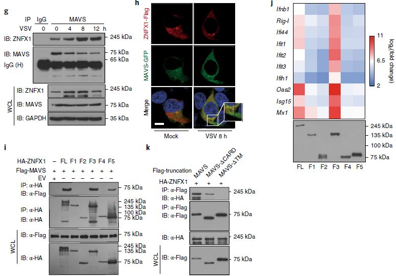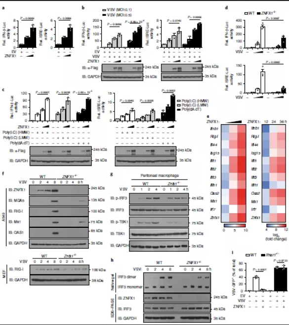 為了研究ZNFX1在IFN信號傳導中的作用,通過ZNFX1過表達質粒和Ifnb1-reporter或IFN刺激的應答元件(ISRE)報告質粒瞬時轉染A549細胞進行螢光素酶報告基因分析,然后進行或不進行VSV感染。結果表明,ZNFX1的過表達輕微激活了Ifnb1啟動子和ISRE報告基因(圖4a)。此外,ZNFX1以劑量依賴的方式顯著增強了由VSV、2種類型的poly(I:C)或poly(dA:dT)觸發(fā)的Ifnb1啟動子激活(圖4b,c)。相反,敲除Znfx1可降低VSV誘導的293T細胞中Ifnb1報告基因和ISRE報告基因的激活(圖4d)。Ifnb1和ISGs的轉錄以劑量和時間依賴性的方式誘導(圖4e),當ZNFX1在A549細胞中過表達時隨著劑量和時間增強反之敲除ZNFX1則降低。而與野生型細胞相比,Znfx1-/-A549和MEF細胞中ISG蛋白表達量分別減少(圖4f)。VSV感染后Znfx1-/-巨噬細胞中TBK1和IRF3的磷酸化低于野生型巨噬細胞(圖4g)。在VSV感染的Znfx1-/-293T細胞中,IRF3的二聚化也低于野生型細胞(圖4h)。野生型A549細胞中觀察到了VSV的限制性復制,但在Ifnar1-/-A549細胞中未觀察到(圖4i)。所有這些數(shù)據(jù)表明,ZNFX1通過誘導I型IFN的產生而參與抗病毒免疫反應,其抗病毒特性也取決于IFN信號傳導。