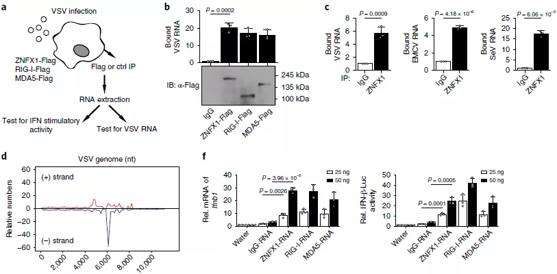 屬于RNA解旋酶SF2的許多基因被鑒定為結合病毒RNA的RNA病毒傳感器,因此假設屬于SF1的ZNFX1也可能作為RNA傳感器結合病毒RNA。為證實這一假設,首先在293T細胞中過表達ZNFX1,然后進行pulldown和qRT-PCR分析以確定ZNFX1與VSV-RNA的高結合能力(圖5a,b)。也檢測了內源性ZNFX1與A549細胞中的VSV,EMCV和仙臺病毒(SeV)RNA的結合能力(圖5c)。通過用抗內源性ZNFX1的抗體從免疫沉淀物中分離RNA來進行RNA免疫沉淀(RIP)測序分析,將ZNFX1相關的RNA比對到VSV基因組(圖5d),優(yōu)先定位于約6,000-8,000 nt的VSV片段(圖5e)。值得注意的是,當與ZNFX1相關的RNA轉染到A549細胞中時,通過qRT-PCR和熒光素酶活性分析觀察到了Ifnb1的誘導轉錄和基于Ifnb1啟動子的報告基因的誘導表達(圖5f)。