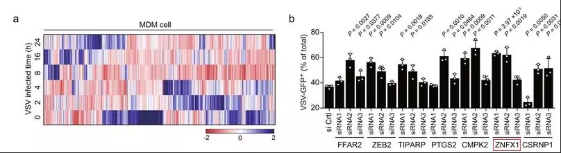 作者首先分析了他們先前發(fā)表的被水皰性口炎病毒(VSV)感染的單核細胞衍生巨噬細胞(MDM)的IVT-SAPAS(in vitro transcription-sequencing alternative polyadenylation sites)數(shù)據(jù),并發(fā)現(xiàn)了許多表達改變的基因。【之前已發(fā)表文章的數(shù)據(jù)重新挖掘】通過比較受VSV感染的人MDM數(shù)據(jù)和小鼠腹膜巨噬細胞數(shù)據(jù),發(fā)現(xiàn)了一些共同的基因,它們被上調了三倍以上,包括FFAR2,ZEB2,TIPAP,PTGS2,CMPK2,ZNFX1和CSRNP1。隨后敲除A549細胞中的這些基因,用VSV-eGFP(VSV-增強型綠色熒光蛋白)感染細胞,流式細胞術檢測GFP陽性細胞的百分比表明,敲減ZNFX1(其抗病毒作用尚未見報道)促進了VSV感染。