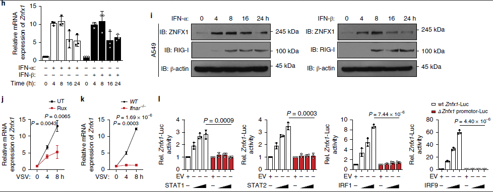 由于病毒感染導致ZNFX1的mRNA和蛋白質水平表達均增強,接下來通過將A549細胞與人重組IFN-α和IFN-β一起孵育來檢測ZNFX1是否為ISG。qRT-PCR和免疫印跡分析的結果表明ZNFX1的表達可以被IFN-α和IFN-β誘導(圖1h,i)。相比之下,JAK1抑制劑魯索替尼(ruxolitinib)可以抑制VSV對Znfx1 mRNA的誘導,并且在Ifnar1-/-A549細胞中幾乎消失(圖1j,k)。