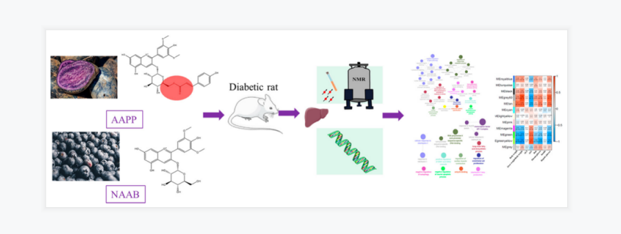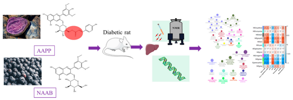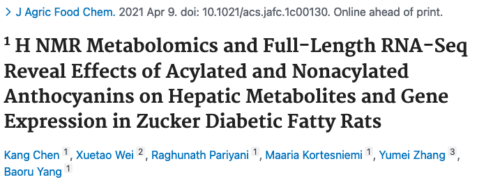 花色苷是植物中的一大類多酚化合物,目前已知是對(duì)氧化應(yīng)激、炎癥和能量穩(wěn)態(tài)有調(diào)節(jié)作用。已有報(bào)道發(fā)現(xiàn)花色苷具有抗糖尿病的療效?;ㄉ盏暮诵慕Y(jié)構(gòu)是花青苷,它可以糖基化形成非酰化的花青苷,糖苷可以?;笮纬甚;幕ㄇ嘬?。且最近有研究表明,與未酰化的花青苷相比,?;ㄇ嘬站哂懈玫姆€(wěn)定性和抗氧化活性。本研究利用全長(zhǎng)轉(zhuǎn)錄組學(xué)和核磁共振代謝組學(xué)方法,比較了非酰化和酰化花色苷對(duì)糖尿病大鼠肝臟基因表達(dá)和代謝的影響。這是第一次綜合應(yīng)用這兩種強(qiáng)大的技術(shù)來(lái)研究肝臟基因表達(dá)和代謝產(chǎn)物的變化。