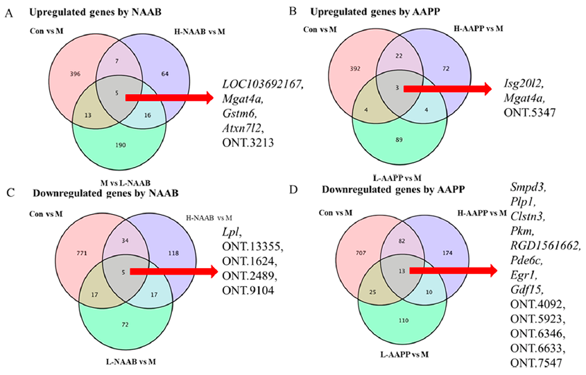 韋恩圖表明了不同分組之間上調(diào)和下調(diào)的DEG的交集,揭示了受NAAB和AAPP影響的特定基因(圖2A?D)。Gstm6與谷胱甘肽代謝、藥物代謝以及細(xì)胞色素P450對(duì)外源物質(zhì)的代謝有關(guān),在胰島素抵抗和糖尿病小鼠中均被報(bào)道下調(diào),并可能參與T2D的進(jìn)展。L-NAAB和H-NAAB均能恢復(fù)Gstm6的表達(dá)。與ND組和Con組相比,M組中有一個(gè)共同的基因被兩種花色苷提取物(NAAB和AAPP)上調(diào),即編碼N-乙酰氨基葡萄糖轉(zhuǎn)移酶GnT-4a的Mgat4a。在小鼠中,Mgat4a基因的遺傳失活導(dǎo)致葡萄糖轉(zhuǎn)運(yùn)蛋白2N-聚糖的錯(cuò)誤組裝,導(dǎo)致葡萄糖轉(zhuǎn)運(yùn)蛋白2和質(zhì)膜凝集素Galectin 9之間的相互作用失敗,導(dǎo)致葡萄糖轉(zhuǎn)運(yùn)蛋白2內(nèi)化,從而抑制葡萄糖攝取和葡萄糖刺激的胰島素分泌。還發(fā)現(xiàn)高脂飲食抑制了Mgat4a的表達(dá)。藍(lán)莓的非?;ㄉ蘸妥仙R鈴薯的?;ㄇ嘬斩际侨绱恕>幋a脂蛋白脂肪酶的LPL在小鼠肝臟中過(guò)表達(dá),導(dǎo)致肝臟甘油三酯含量增加2倍,并導(dǎo)致胰島素抵抗,部分原因是對(duì)胰島素的反應(yīng)受損,抑制內(nèi)源性葡萄糖的產(chǎn)生。在本研究中,L-NAAB和H-NAAB都下調(diào)了ZDF大鼠高水平的LPL,這可能導(dǎo)致胰島素敏感性的改善。早期生長(zhǎng)反應(yīng)基因-1(Egr1)可被胰高血糖素短暫激活,介導(dǎo)胰高血糖素調(diào)節(jié)的糖異生。AAPP降低Egr1,這可能與糖異生減少有關(guān)。